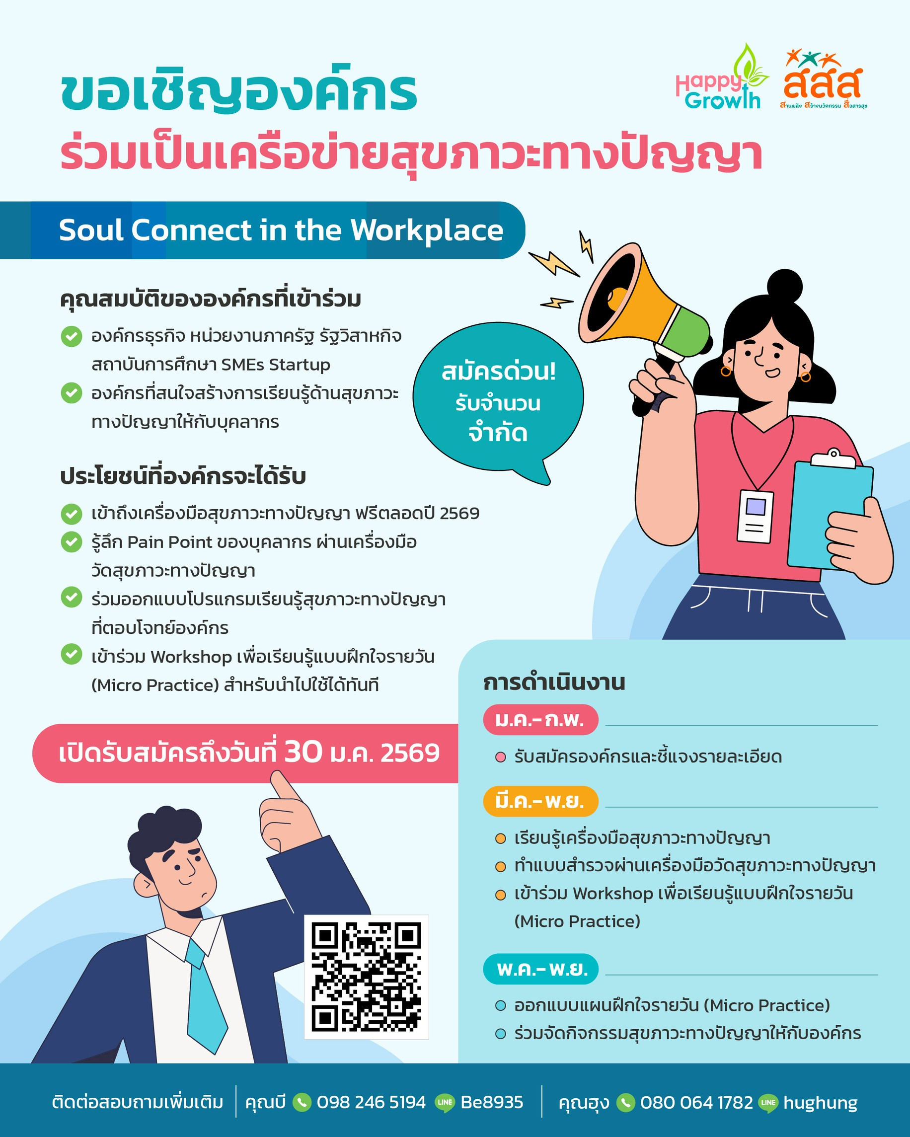 เสียงจากองค์กรเครือข่ายของโครงการ Happy Growth ที่ได้ร่วมดูแล “สุขภาวะทางปัญญา” ในที่ทำงานผ่านการเรียนรู้ ลงมือปฏิบัติ และเติบโตเคียงข้างกัน เพื่อสร้างพื้นที่แห่งความไว้วางใจ ความเข้าใจซึ่งกันและกัน และความหมายในการทำงานร่วมกันชวนรับฟัง รับรู้ และค้นพบแรงบันดาลใจ เพื่อเริ่มต้นหรือขยายพื้นที่สุขภาวะทางปัญญาในองค์กรของคุณเอง
